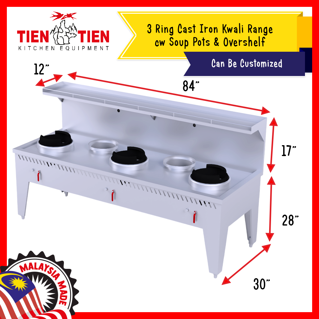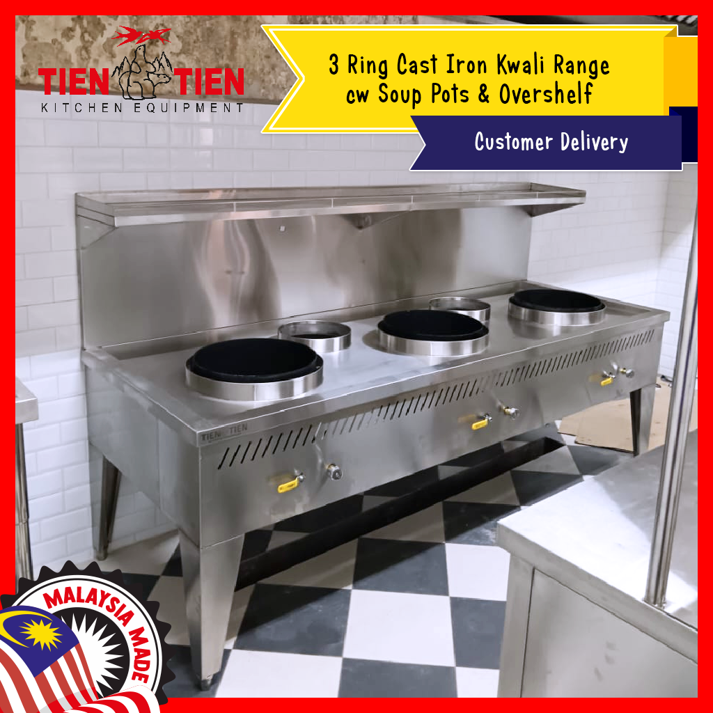 TIEN TIEN 3 Ring Cast Iron Kwali Range cw Soup Pots & Overshelf